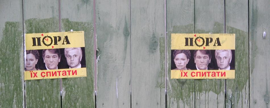 | На заборах были расклеены листовки с изображениями Ющенко, Януковича и Тимошенко, которых народ призывал к ответу. Здесь, как и в центре города, чувствовалось революционное настроение. Ведь через два дня народ Украины будет отмечать первую годовщину "Оранжевой революции"! Чувствуется, что массы ещё не остыли и рвуться в бой. |